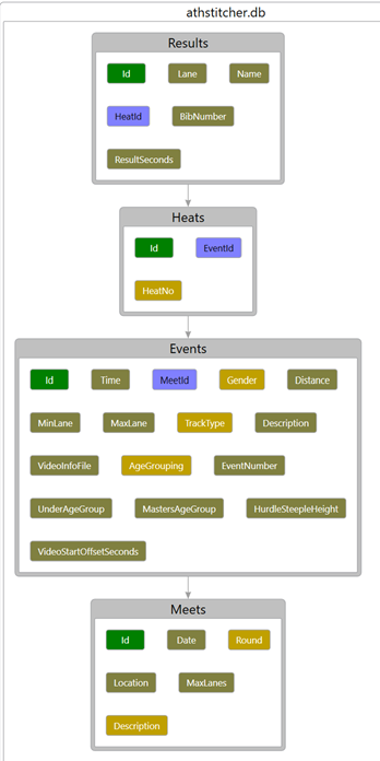 The AthStitcher app has been extended to use a local Sqlite database to store the results of athletic meets. The app is written in C# using WPF and Entity Framework (EF) for the ORM.