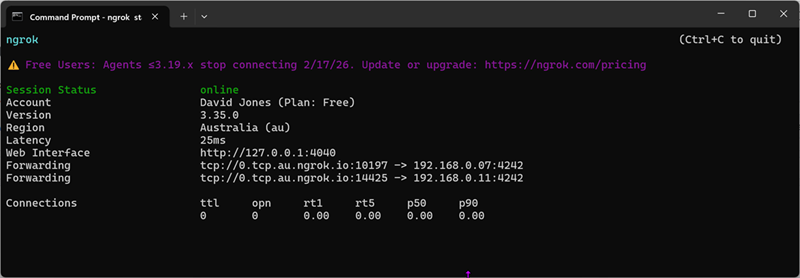 This will give an external IPAddress and port such as 0.tcp.au.ngrok.io and 16119 to use as an external TCP connection to the target local device at 192.168.0.11:4242.